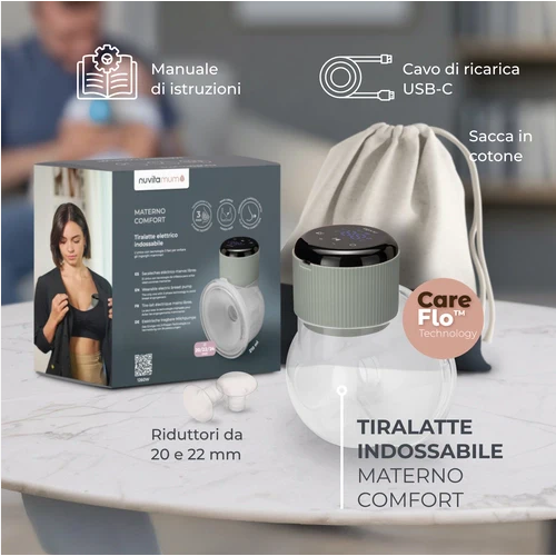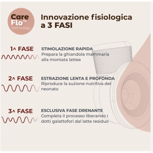CareFlo? Technology – Sistema a 3 fasi fisiologiche (stimola, estrae, libera) per svuotare il seno e prevenire ingorghi e mastiti.